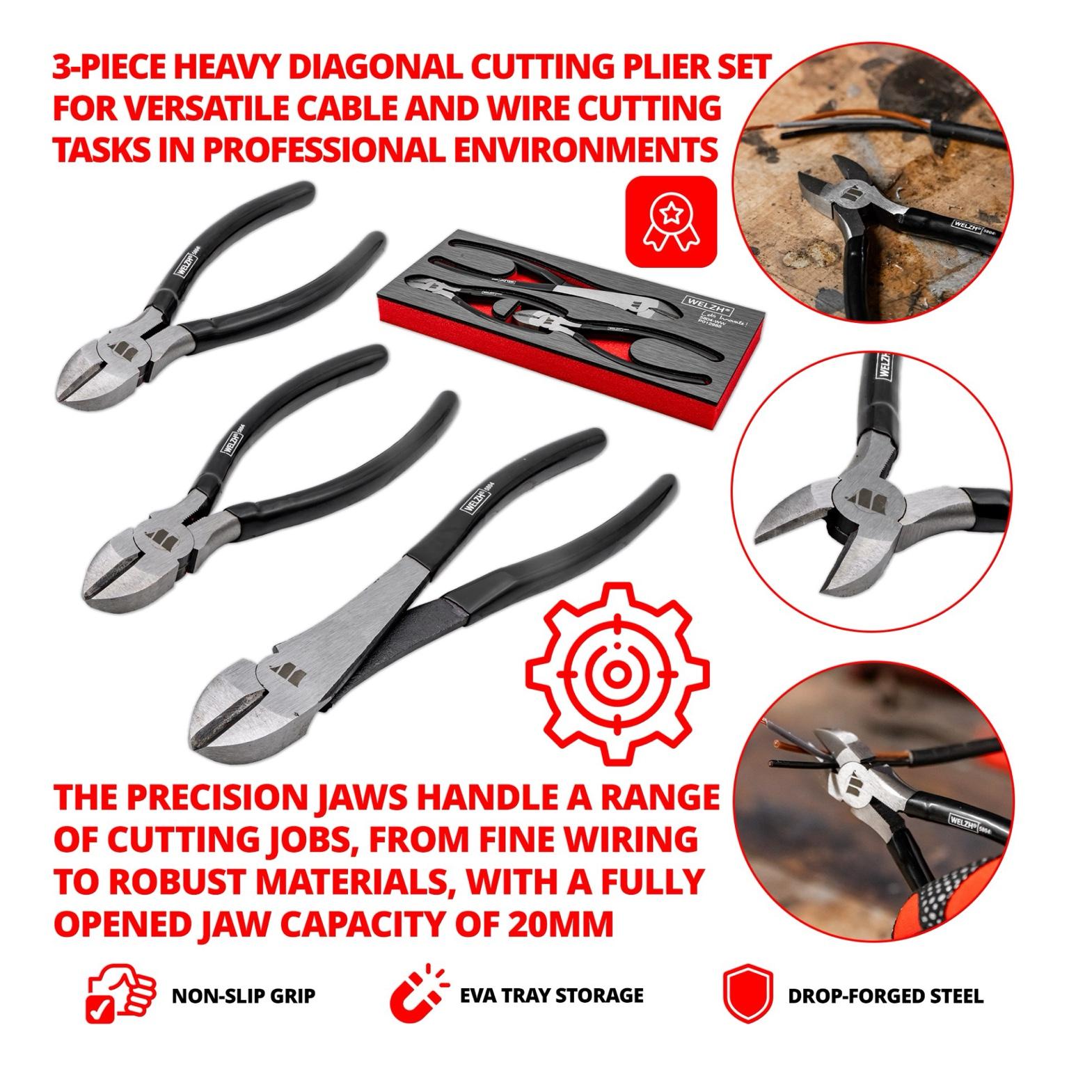 This 3-piece diagonal cutting plier set, in sizes 160mm, 190mm, and 255mm, easily cuts through cables, soft, and hard wires. Built for versatility, the pliers offer a 20mm fully opened jaw for a wide range of tasks.