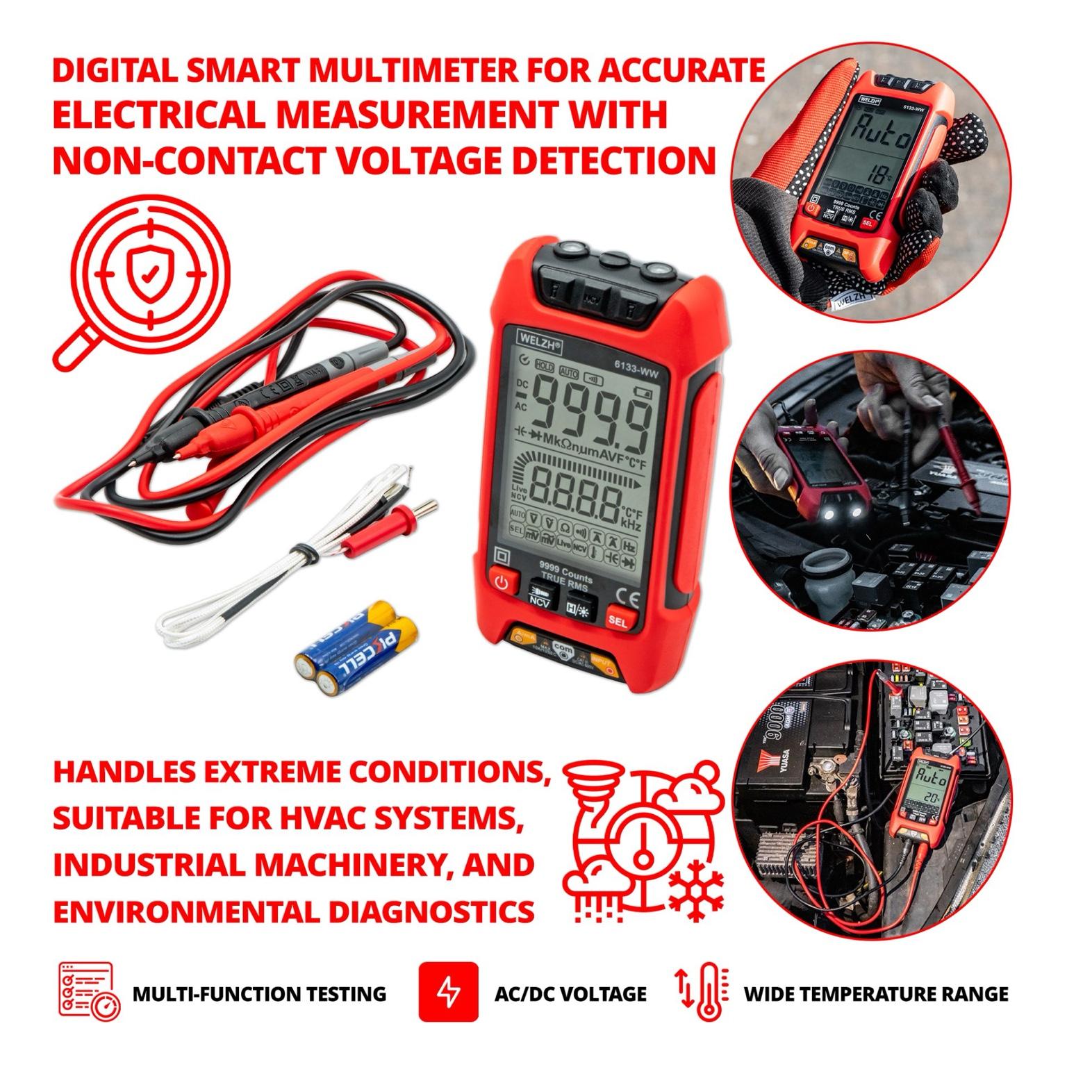 With NCV technology, the multimeter detects AC voltages without direct contact, enhancing user safety. It also tests continuity, diodes, and helps identify live wires, making electrical work safer and more efficient.