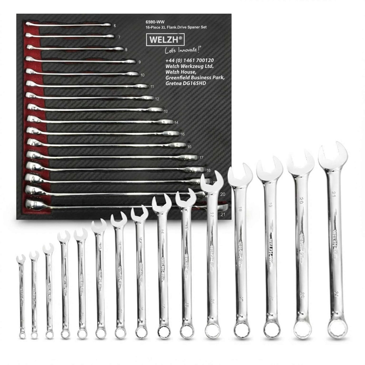 Extra Long Combination Spanner Wrench Set Flank-Drive 16pc 6-21mm – Welzh Werkzeug