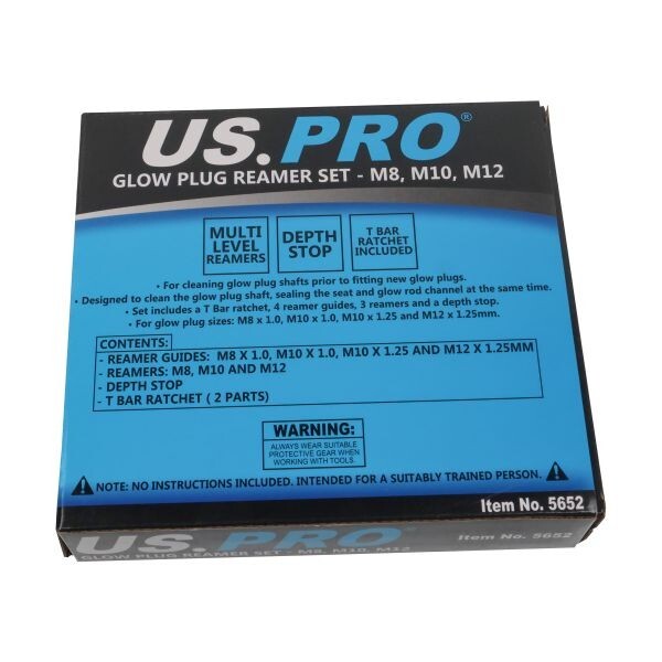 Set includes a T Bar ratchet, 4 reamer guides, 3 reamers and a depth stop. For glow plug sizes: M8 x 1.0, M10 x 1.0, M10 x 1.25 and M12 x 1.25mm.