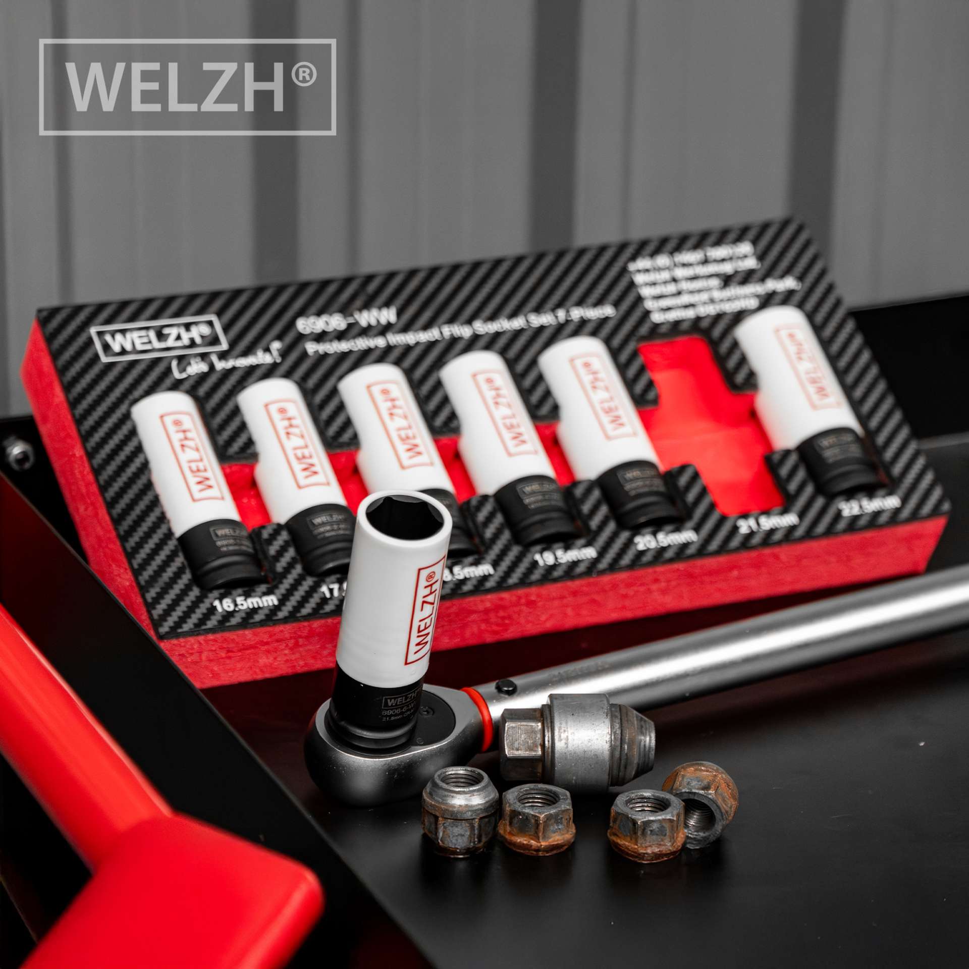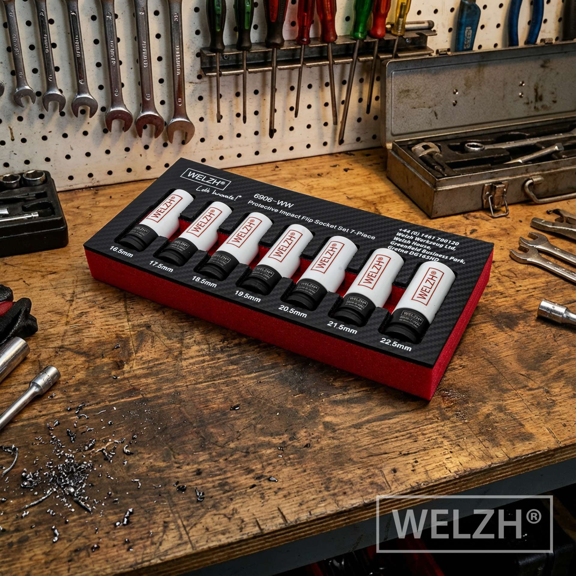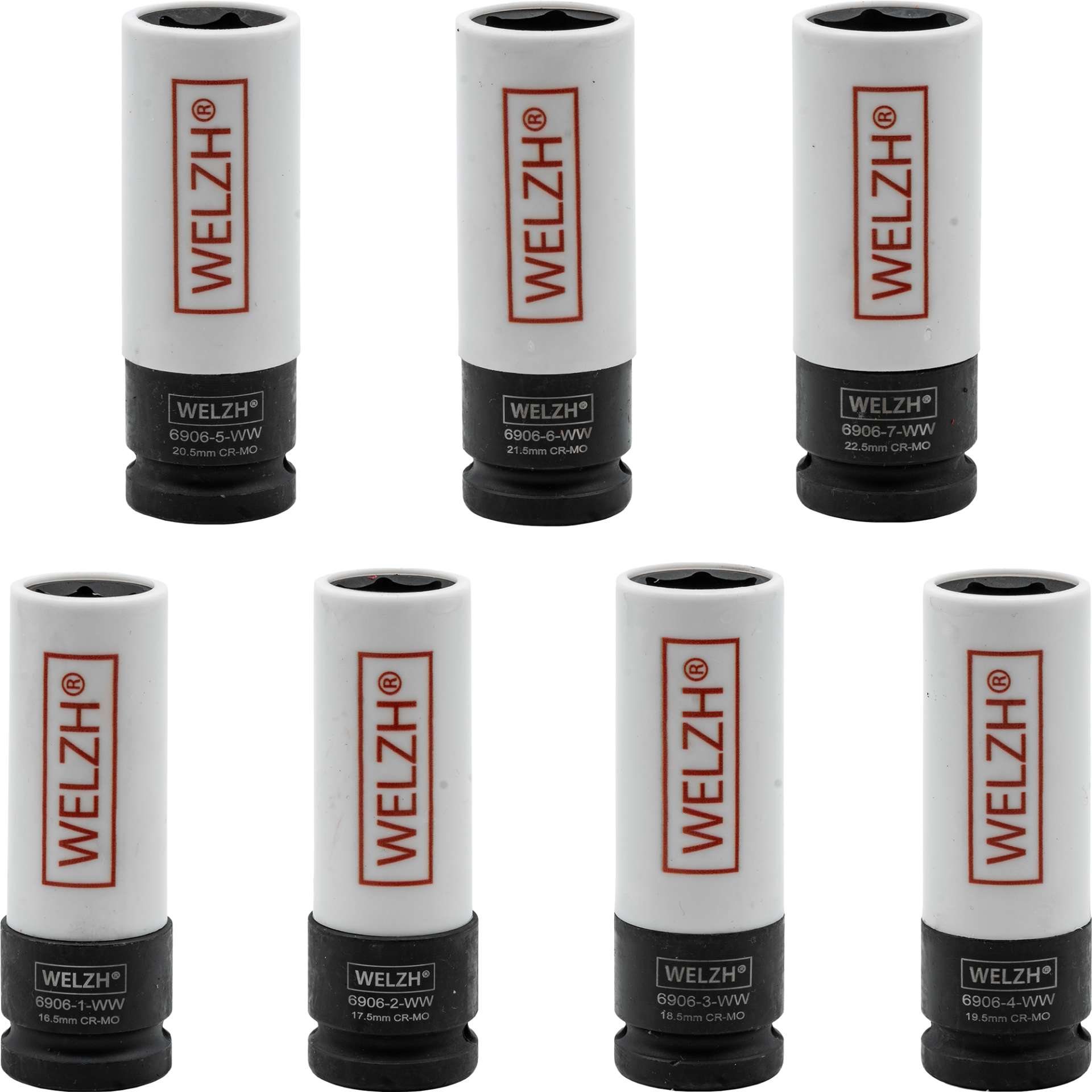 This set includes flip sockets in 22.5mm, 21.5mm, 20.5mm, 19.5mm, 18.5mm, 17.5mm and 16.5mm sizes, offering flexibility needed to cover a wide range of wheel and nut applications.