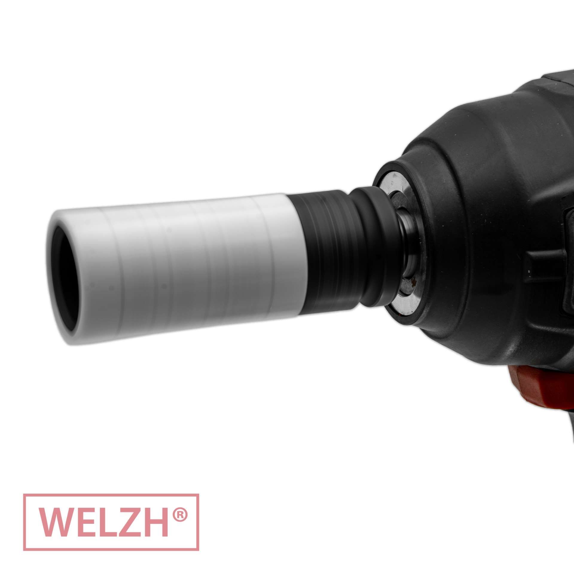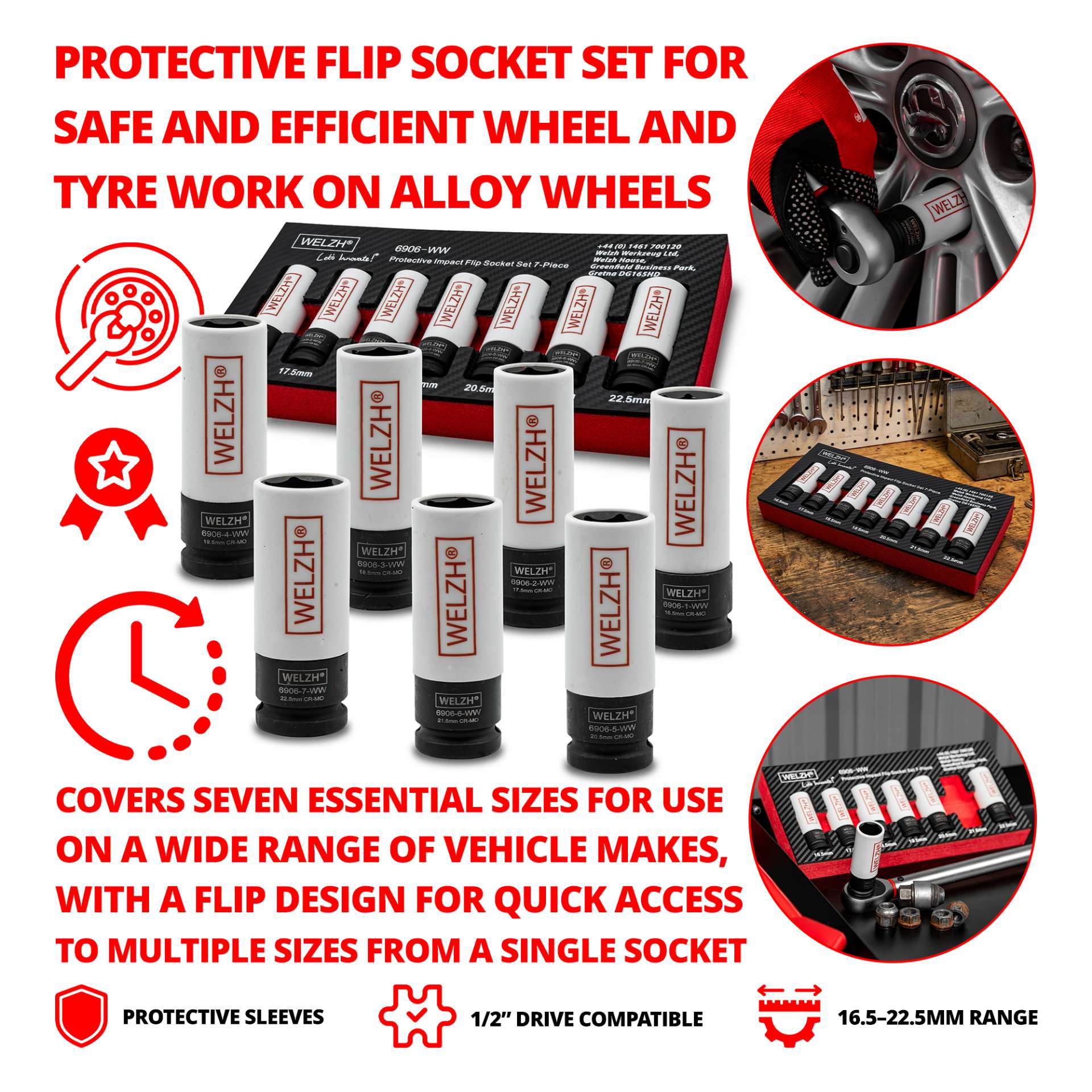 Each socket features a durable plastic sleeve that prevents scratches and scuffs during use, making it ideal for professional tyre and wheel service.