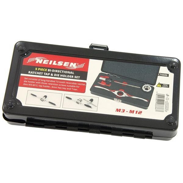 Set consists of long handled 72-tooth reversible ratchet, die holder with three retention screws suitable for dies M3-M12, tap holder, 3mm hex key and T-bar.