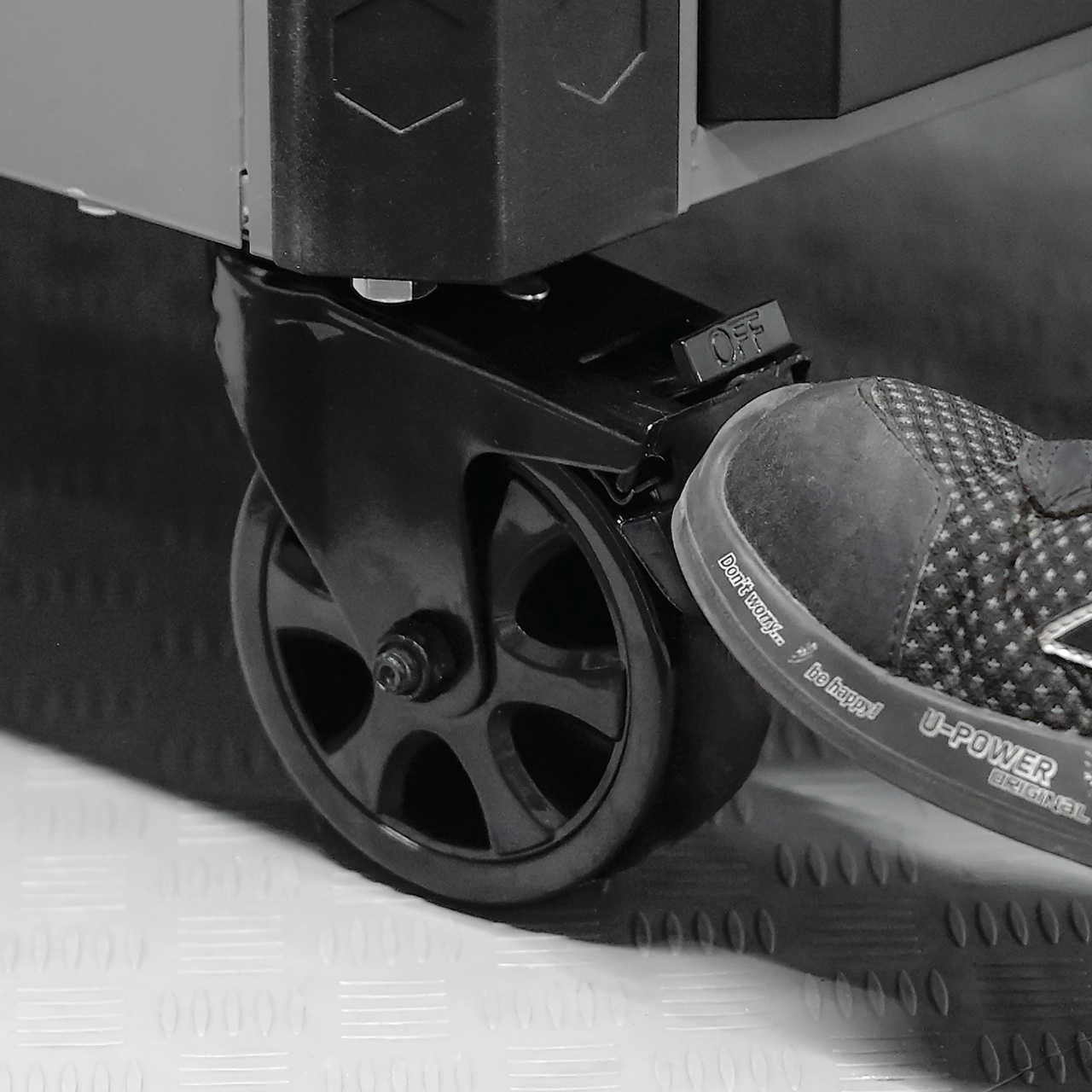 • MANOEUVRABILITY – Fitted with four stylish Ø5′ x 2′ castors, two fixed and two swivel with brakes and a durable shatterproof plastic side handle.