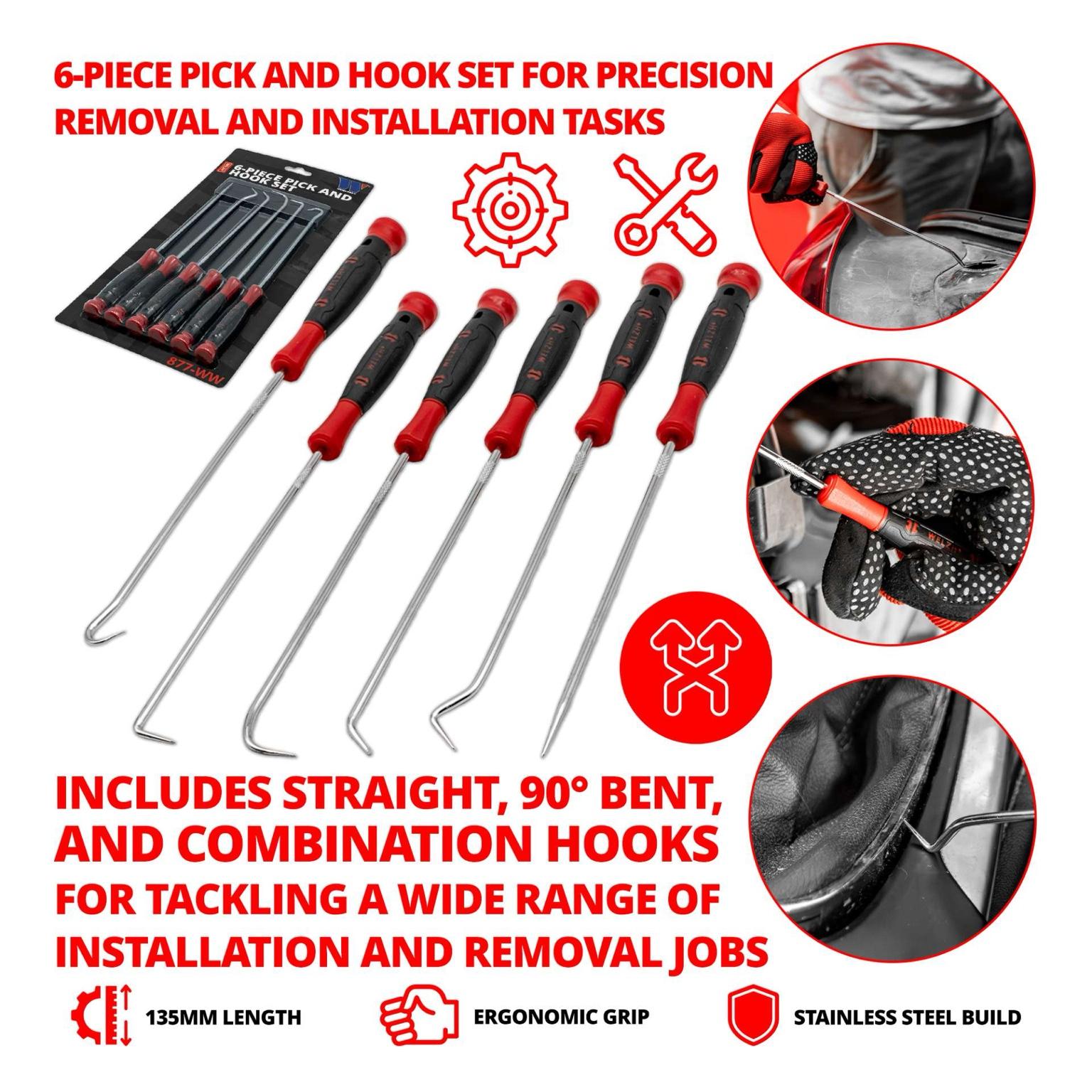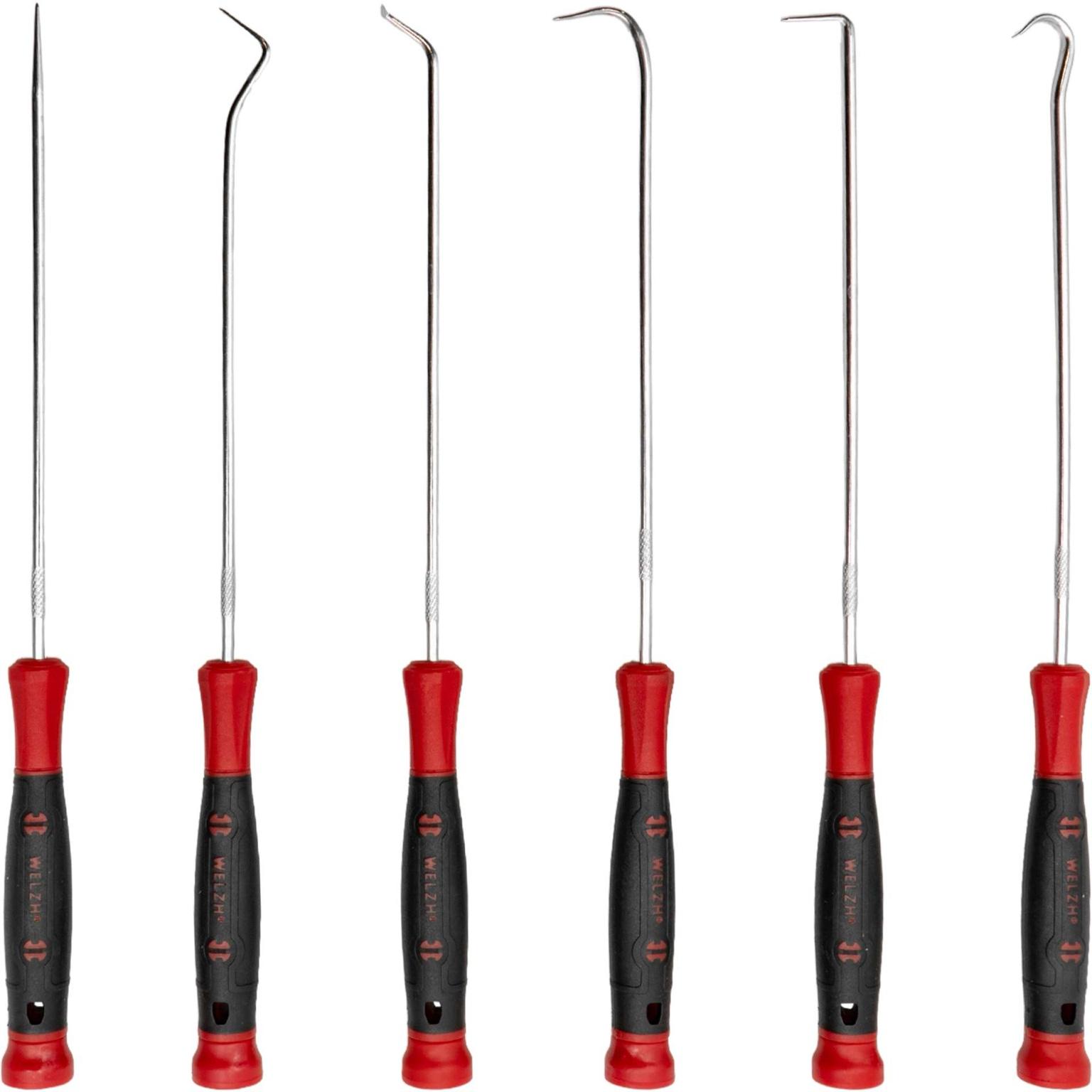 The set includes tools with straight tips, 90 degree bent tips for O-rings, and combination hook tips, providing solutions for various removal and installation tasks.